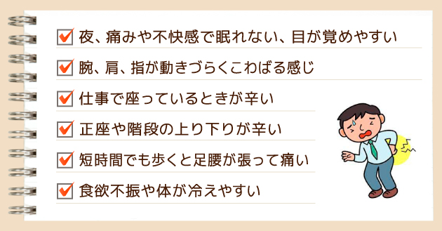 腰痛(急性・慢性)、椅子に座ると腰が痛む、椅子から立つ際腰か痛く身体が伸びない、骨盤が歪んでる、足の長さや足のつき具合が左右で違う、腰椎椎間板ヘルニア、股関節の痛み、坐骨神経痛、膝を曲げると痛い、正座が出来ない、階段の昇り降りが辛い、足のむくみ、立っているのが辛い、足をよくつる、お腹が弱い、よく下す