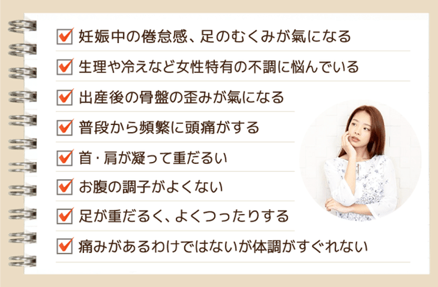 生理不順、生理痛、PMS、更年期(上半身のほてり、発汗、感情の不安定、冷え性)、へバーデン結節、子宮筋腫、卵巣嚢胞、不妊症、逆子、妊娠中の心身の不調(初期から後期)、便秘、産後の不調や育児の疲れや寝不足、氣持ちの不安定など