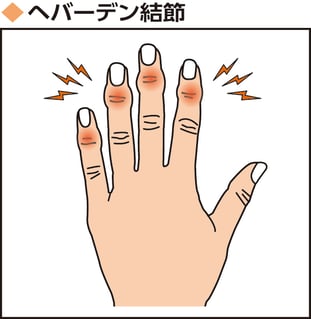 第1関節中央の伸筋腱付着部を挟んで2つの結節ができてしまう原因不明の症状。人差し指から小指にかけて第1関節が赤く腫れたり、曲がったりし、 痛みを伴う場合もあります。
